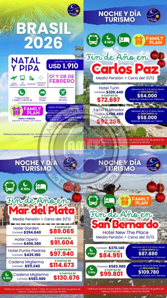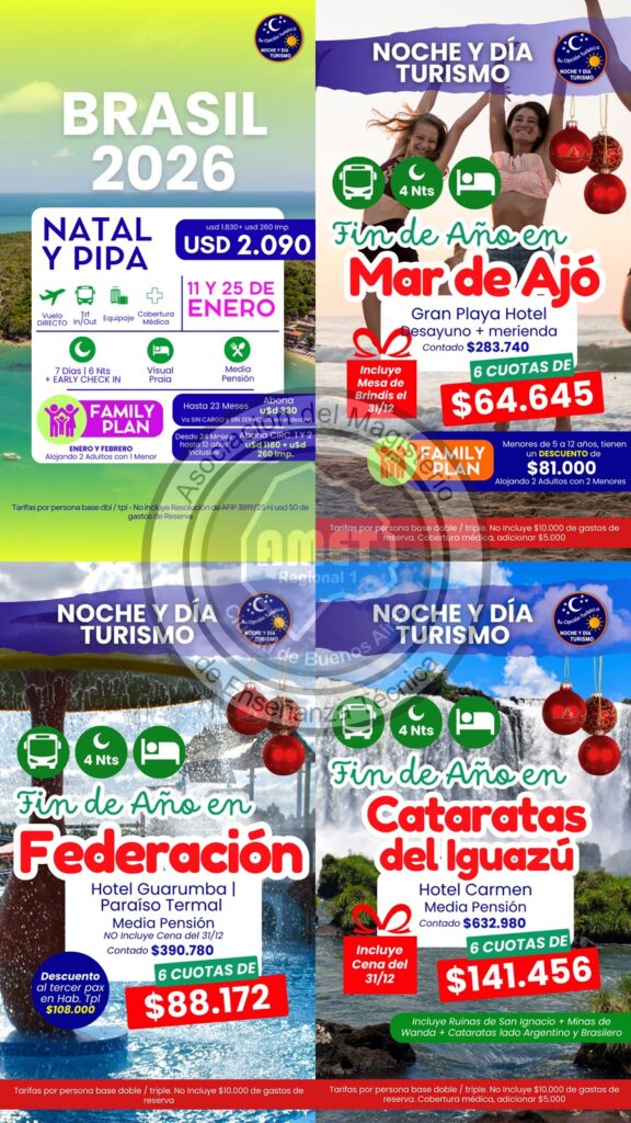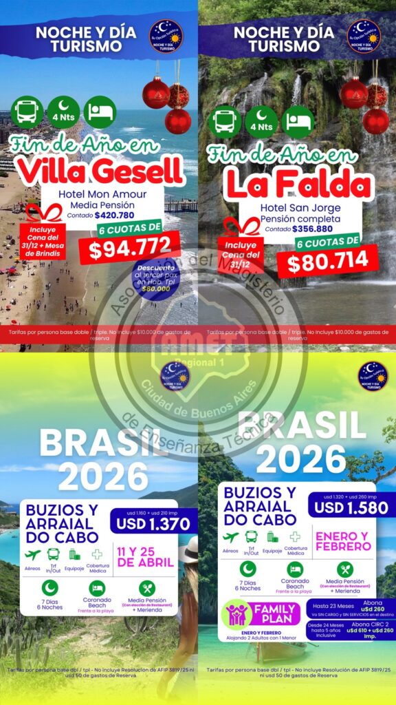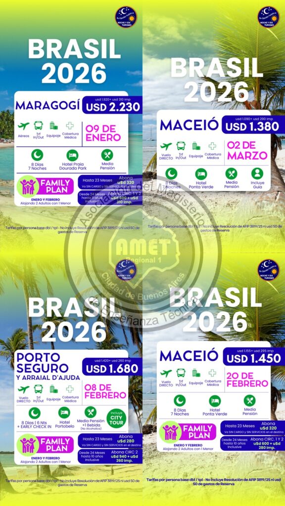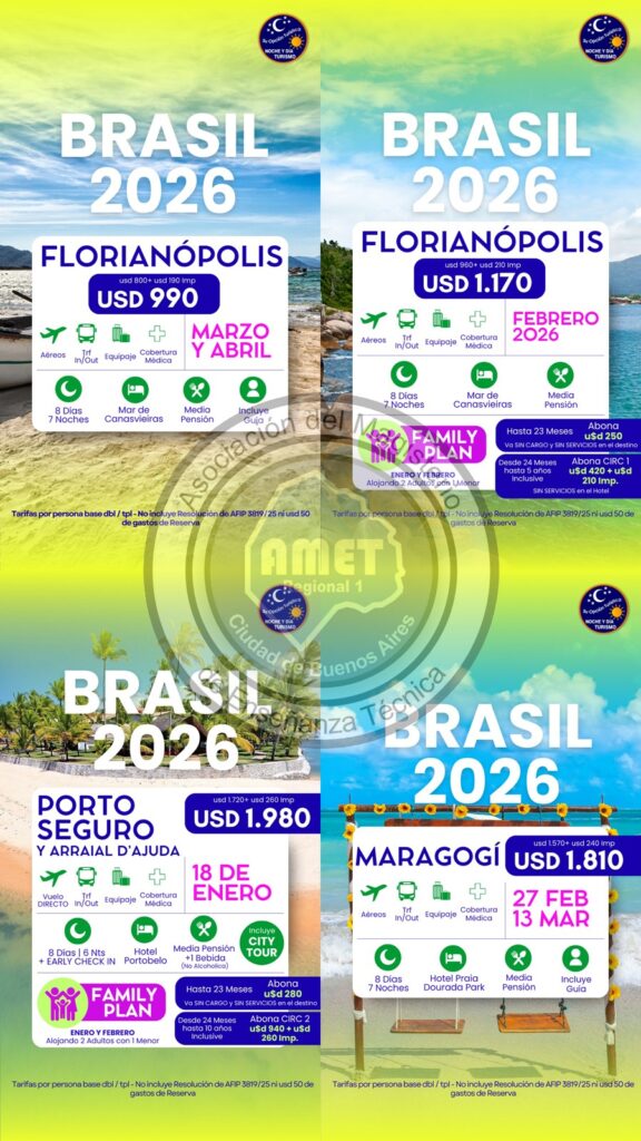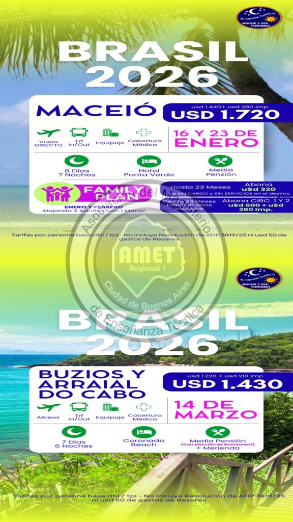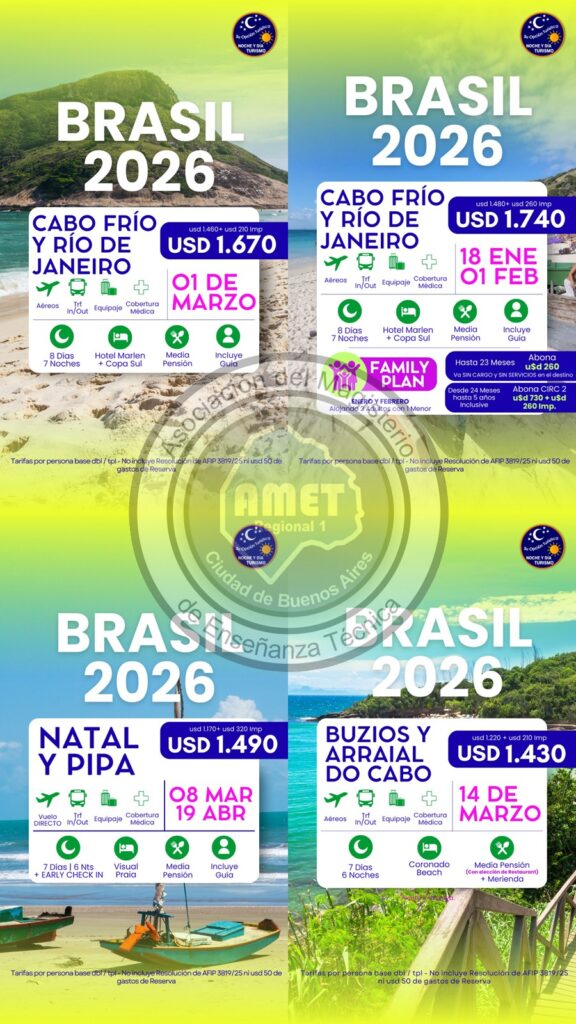 Atentos a los continuos cambios y modificaciones en los protocolos de seguridad y normas sanitarias, para viajes nacionales e internacionales, es conveniente aclarar que la Asociación del Magisterio de Enseñanza Técnica (AMET Regional 1), deslinda responsabilidad alguna sobre posibles reclamos que surjan en cuanto a la adquisición de paquetes adquiridos por afiliado alguno y su grupo familiar y que vea impedido su utilización ante la situación de aislamiento que es de publico conocimiento. El afiliado deberá proceder al reclamo correspondiente ante la agencia emisora del paquete.